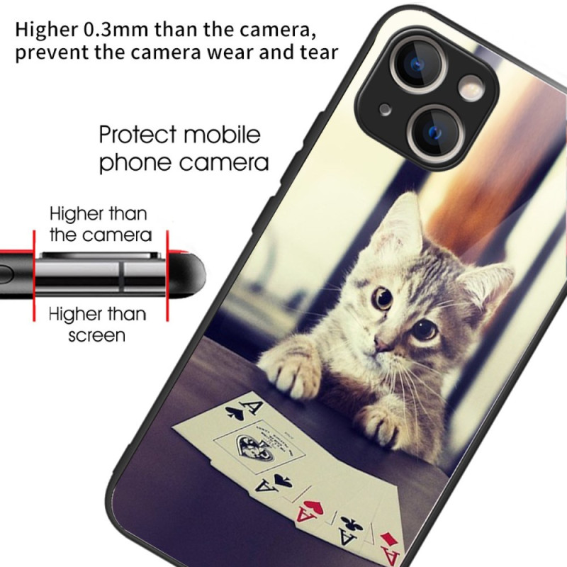 Tutustu innovatiiviseen suojakoteloon iPhone 15 Plus -puhelimelle. Yhdistämällä pehmeän TPU-reunan ja karkaistun lasin takaosan se tarjoaa monikerroksisen suojan putoamisia ja naarmuja vastaan. Sen erottuva kissakuvio tuo laitteeseesi ripauksen tyyliä. Tässä kotelossa on 0,3 mm:n korotettu reuna kameran linssin suojaamiseksi ja vahvistettu 360 asteen suoja, joten siinä yhdistyvät suojaus ja muotoilu.