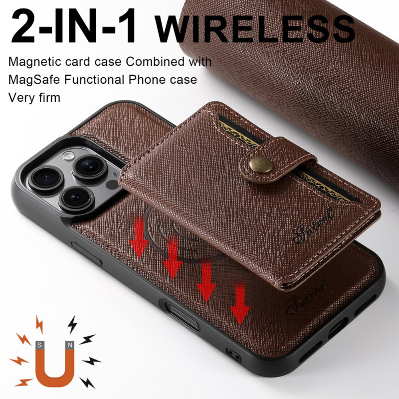 Tutustu tyylikkääseen magneettikoteloon iPhone 15 Pro Maxille. Teksturoidusta PU-nahasta valmistettu suojakuori tarjoaa vankan suojan ja hienostuneen muotoilun. Irrotettava korttipidike lisää käytännöllisyyttä, ja MagSafe-yhteensopivuus takaa helpon langattoman latauksen. Täydellinen yhdistämään tyylin ja käytännöllisyyden arjessa.