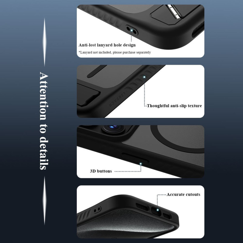 Tutustu LEREACHin Le-Chic-sarjan koteloon iPhone 15 Pro:lle, jossa yhdistyvät kestävyys ja toiminnallisuus. MagSafe-yhteensopivuuden, integroidun jalustan ja vahvistetun suojan ansiosta tämä suojakuori tarjoaa optimaalisen käyttökokemuksen. Nauti täydellisestä suojasta ja vertaansa vailla olevasta mukavuudesta arvokkaalle älypuhelimellesi.