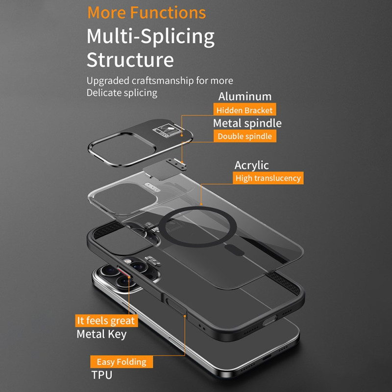 Tutustu innovatiiviseen magneettikoteloon iPhone 15 Pro:lle. Joustavasta TPU:sta ja kirkkaasta akryylistä valmistettu suojakotelo tarjoaa vankan suojan säilyttäen samalla puhelimesi esteettisen ilmeen. Integroitu jalusta mahdollistaa handsfree-katselun pysty- tai vaakatasossa. MagSafe-yhteensopiva kätevää langatonta latausta varten. Nauti täydellisestä suojasta ja toimivasta muotoilusta iPhone 15 Pro -puhelimellesi.