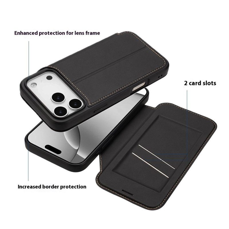 Elegantti ja toimiva nahkamainen suojakuori iPhone 17 Pro Max -puhelimelle suojaa tehokkaasti älypuhelintasi ja antaa samalla hienostuneen kosketuksen. Sen magneettiläppä kiinnittää laitteen ja korttisi täydellisesti, kun taas TPU-sisäkuori vaimentaa iskuja ja estää naarmuja. Sisäpuolella on kaksi erityistä korttipaikkaa, joiden avulla voit kuljettaa kortteja ja muita tärkeitä tavaroita ilman lompakkoa. Huomaamaton ja käytännöllinen suojus toimii myös handsfree-pidikkeenä, joten voit nauttia videoista tai puheluista mukavasti.