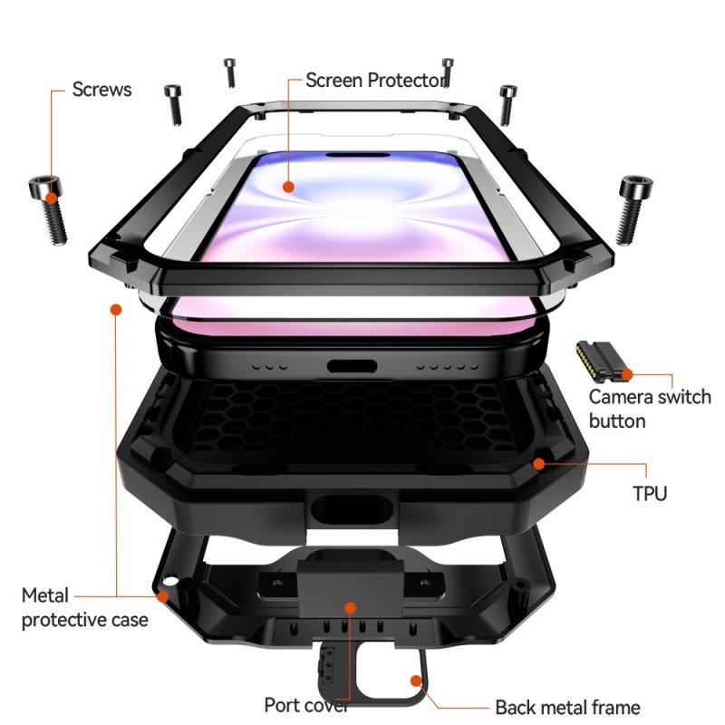 iPhone 17 -puhelimen suojaus nousee uusiin ulottuvuuksiin, sillä se kattaa jokaisen millimetrin, jokaisen portin ja jokaisen linssin. Sen monimateriaalinen panssari sisältää karkaistun lasin näytön ja liukuvan kamerasuojan, jotka tarjoavat laitteellesi loukkaamattoman suojan. IP54-luokituksen ansiosta se on pöly- ja roiskevesitiivis, joten voit käyttää sitä luottavaisin mielin kaikissa olosuhteissa. Tästä linnoituksesta huolimatta toiminnallisuus on edelleen ensiarvoisen tärkeää: handsfree-pidike avautuu medialle, ja langaton lataus on vaivatonta.