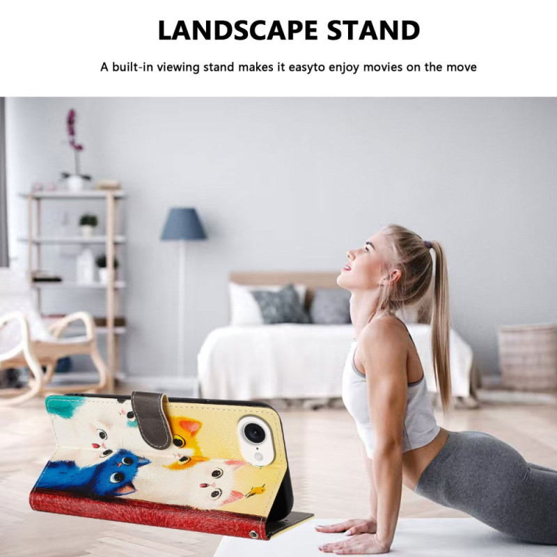 Protégez votre iPhone 17E / 16E avec style grâce à cet étui portefeuille au motif de chats colorés. Conception en cuir synthétique avec coque intérieure souple, fentes pour cartes, support réglable et dragonne amovible pour un usage quotidien pratique et élégant.