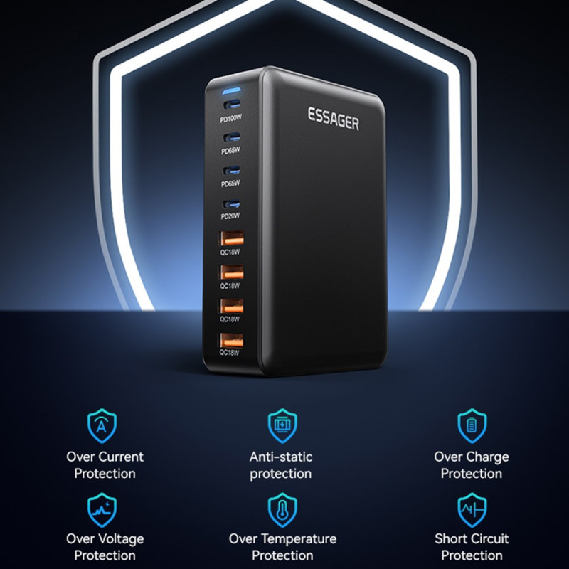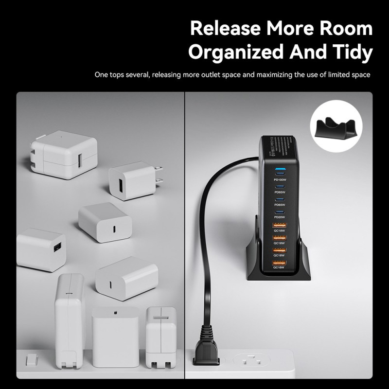 Tutustu äärimmäiseen tehoon tässä 320 W:n GaN-pöytälaturissa, joka tarjoaa 8 samanaikaista latausporttia (4 USB-C + 4 USB-A). Kehittynyt GaN-teknologia takaa kompaktin koon ja poikkeuksellisen suorituskyvyn. Pää-USB-C-portti jopa 100 W vaativimpien laitteiden nopeaan lataamiseen.