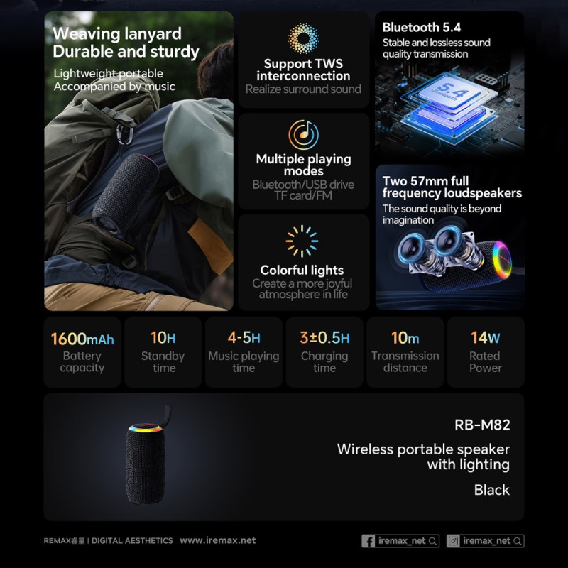Nauti upeasta äänikokemuksesta tässä kannettavassa kaiuttimessa, jossa on kaksi 57 mm:n kuljettajaa. Bluetooth 5.4 -tekniikka takaa vakaan yhteyden, TWS-pariliitäntä mahdollistaa stereoäänen ja värivalot luovat juhlatunnelman. Useita toistotiloja: Bluetooth, USB, TF-kortti ja FM. 4-5h toiminta-aika 1600mAh:n akulla.