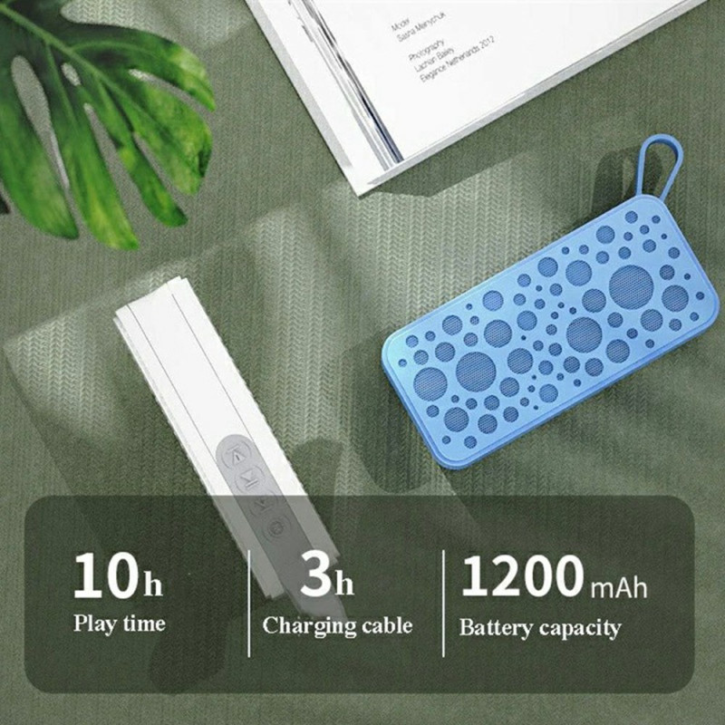 - Pitkäkestoinen akku: 1200 mAh:n akulla varustettu kaiutin tarjoaa 8-10 tuntia jatkuvaa toistoa keskivoimakkuudella. Se on ihanteellinen pitkiin kuuntelusessioihin ilman jatkuvaa lataamista, sillä se latautuu täyteen 2-3 tunnissa.