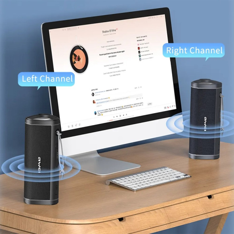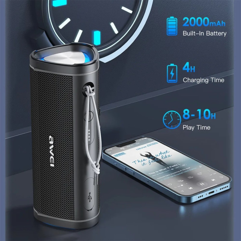Nauti tehokkaasta stereoäänestä AWEI Y331 Bluetooth -kaiuttimella. Se on IPX6-luokan vedenpitävä ja tarjoaa jopa 10 tunnin akunkeston, handsfree-puhelut melua vaimentavalla HD-mikrofonilla ja tukee useita toistotiloja (Bluetooth, TF-kortti, AUX).