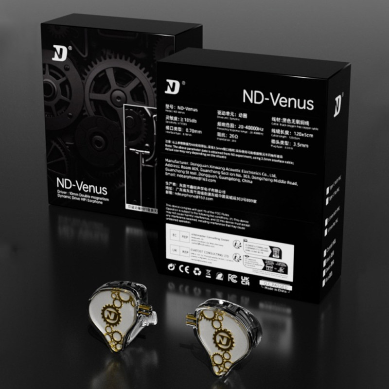 ND Venus -kuulokkeissa käytetään dynaamista, kaksoismagneettisella kalvolla varustettua kaiutinta, joka on suunniteltu tuottamaan yksityiskohtaista ja voimakasta äänentoistoa, huomattavan selkeää laulua ja puhdasta ulotusta 40 kHz:iin asti. Niiden sisäinen rakenne perustuu monikerroksiseen akustiseen viritykseen ja tuuletettuun takaonteloon, joka optimoi ilmanpaineen vaikutuksen ja dynamiikan parantamiseksi. Irrotettava kaksinapainen kaapeli (0,75-0,78 mm) mahdollistaa vaihtamisen tai päivittämisen. Mekaanisesta estetiikasta inspiroituneessa muotoilussa on ohuet, tarkat teolliset muodot, ja ergonominen muotoilu takaa vakaan ja mukavan istuvuuden.