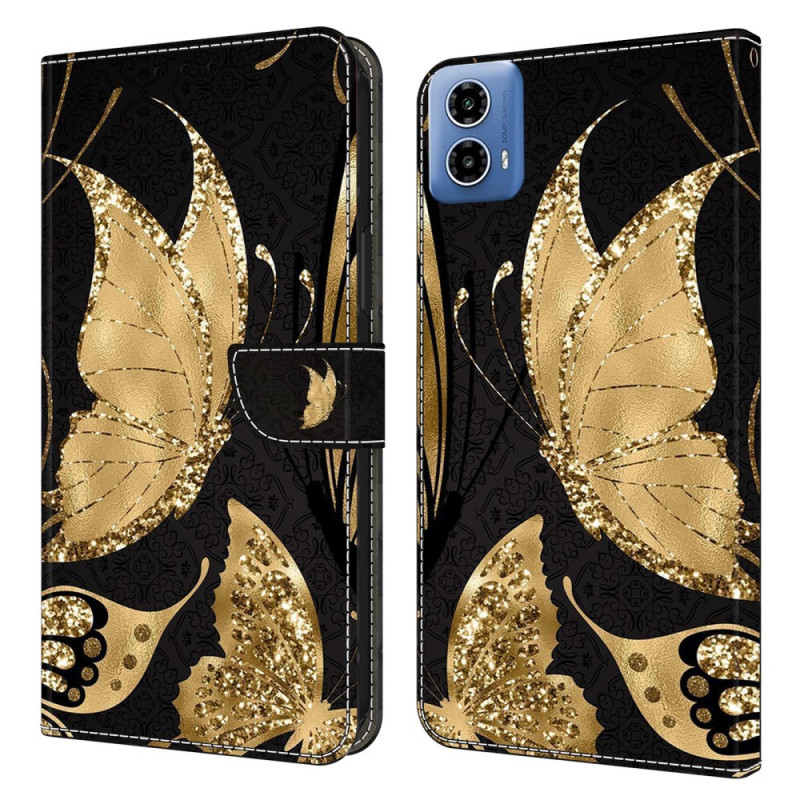 Tutustu tyylikkääseen lompakkokoteloon Motorola Moto G24 Power -puhelimelle. Se yhdistää tyylin ja toiminnallisuuden ja tarjoaa täydellisen suojan laadukkaalla PU-nahkamallilla ja ainutlaatuisella kultaisella perhoskuvioinnilla.
