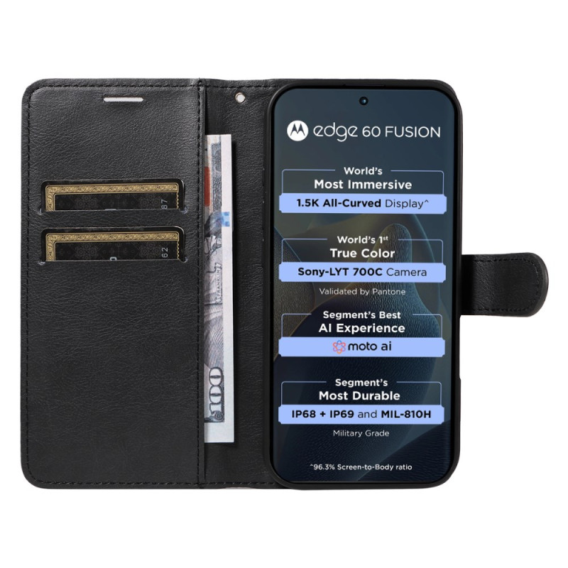 Tutustu tyylikkääseen ja toimivaan lompakkokoteloon Motorola Edge 60 / 60 Fusionille. Laadukkaasta PU-nahasta valmistettu suojakotelo tarjoaa täydellisen suojan naarmuja ja iskuja vastaan.