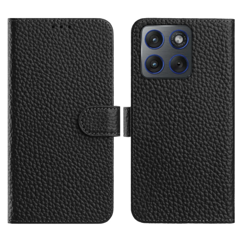 Étui portefeuille élégant en cuir véritable avec texture litchi pour Motorola Edge 70 5G. Doté d'un support ajustable, de 3 emplacements pour cartes et d'une fermeture magnétique sécurisée. Protection optimale contre les chocs grâce aux coussins d'angle.