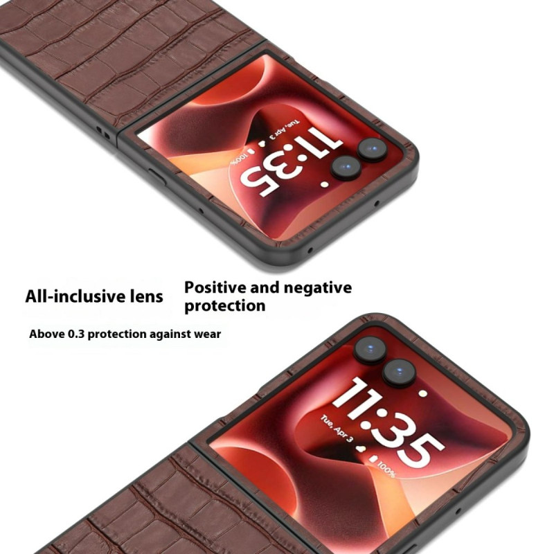 Tutustu aitoon nahkakoteloon Motorola Razr 60 Ultra 5G:lle. Siinä yhdistyvät tyylikkyys ja suojaus, ja se tarjoaa ainutlaatuisen krokotiilimaisen tekstuurin ja täydellisen suojan kolhuilta ja naarmuilta samalla, kun se mahdollistaa helpon pääsyn kaikkiin toimintoihin.