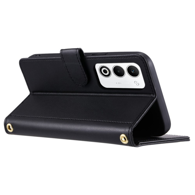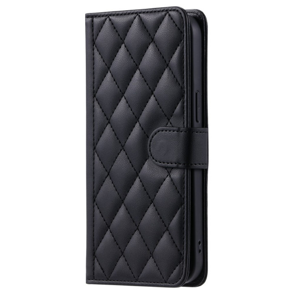 Étui portefeuille élégant en cuir PU avec motif losange sophistiqué. Fonction support intégrée, fermeture magnétique sécurisée et multiples rangements pratiques. Incluant une bandoulière de 145cm et une dragonne pour un transport confortable.