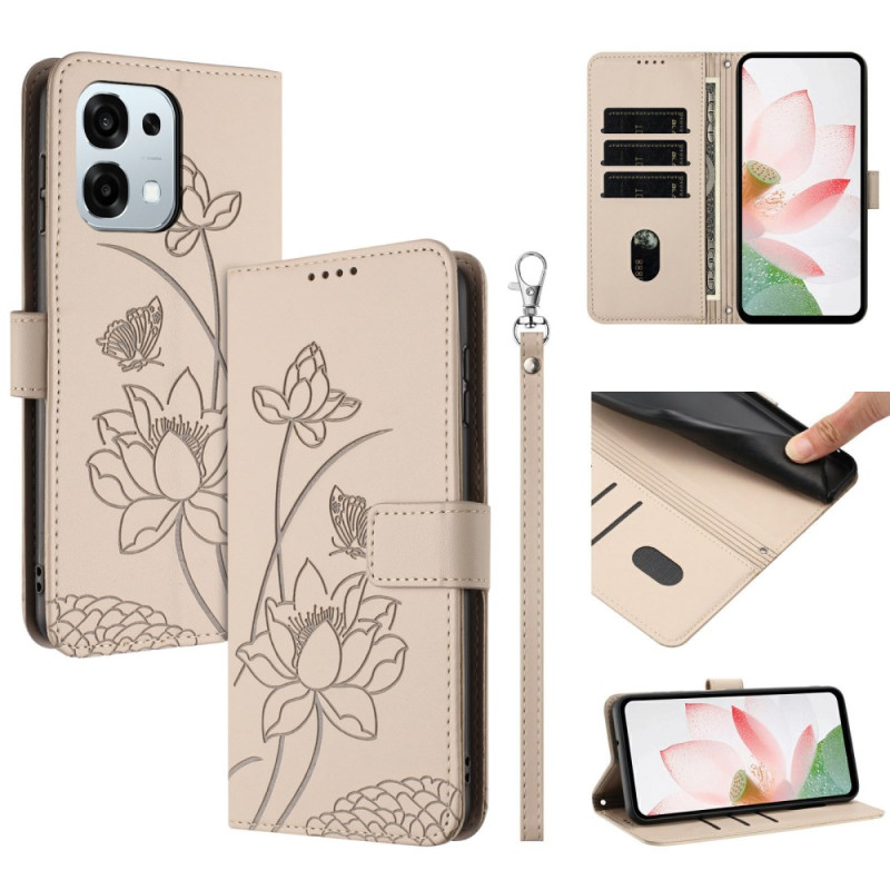 Tyylikäs lompakkokotelo, jossa on painettu lootuskuvio Oppo A6 Pro 5G / 4G -puhelimelle. Yhdistää ensiluokkaisen suojan, lompakkotoiminnallisuuden korttipaikoilla, taitettavan jalustan handsfree-katseluun ja irrotettavan käsihihnan.