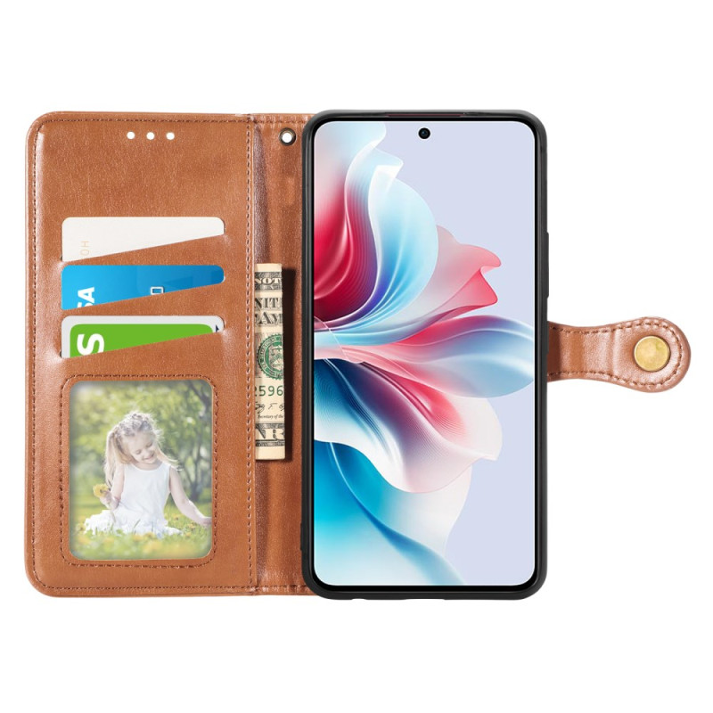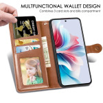 Monitoiminen lompakkokotelo Oppo A6 Pro 5G:lle, jossa on säädettävä jalusta, turvallinen magneettisuljenta ja irrotettava käsihihna. Täydellinen suoja kolhuilta ja naarmuilta, kortti- ja käteisvarojen paikat.