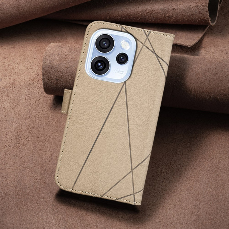 Suojaa Oppo Reno 15 F 5G tällä tyylikkäällä lompakkokotelolla. Moderni geometrinen muotoilu, petostentorjunta RFID-sulku, 3 korttipaikkaa ja setelilokero. Integroitu taitettava jalusta handsfree-katseluun.