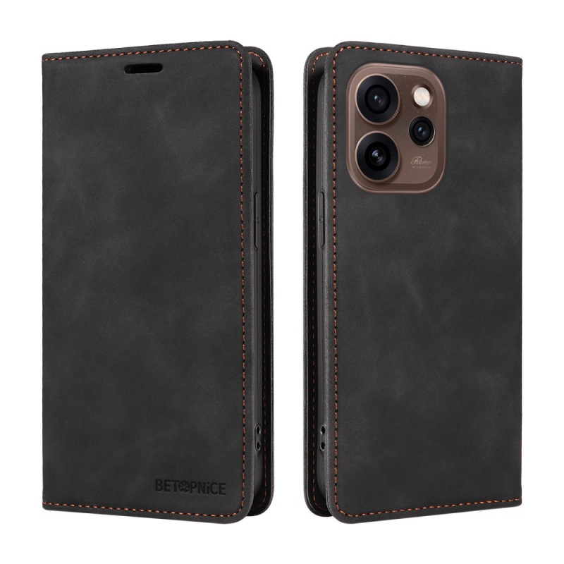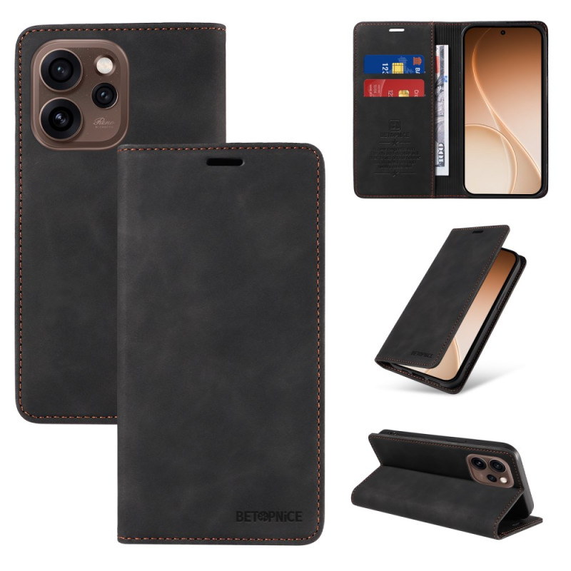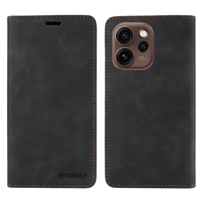 Nahkainen lompakkokotelo Oppo Reno 15 Pro 5G:lle, jossa on turvallinen magneettisuljenta ja RFID-sulkutekniikka. Sisältää 2 korttipaikkaa, 1 käteistaskun ja säädettävän jalustan optimaalista handsfree-katselua varten.