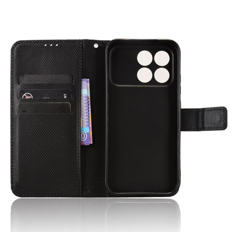 Tyylikäs lompakkokotelo, jossa on timanttinen rakenne Xiaomi Poco F8 Pro -puhelimelle. Mukana useita korttipaikkoja, käteistasku ja käytännöllinen käsihihna. Täysi suojaus ja tukitoiminto.