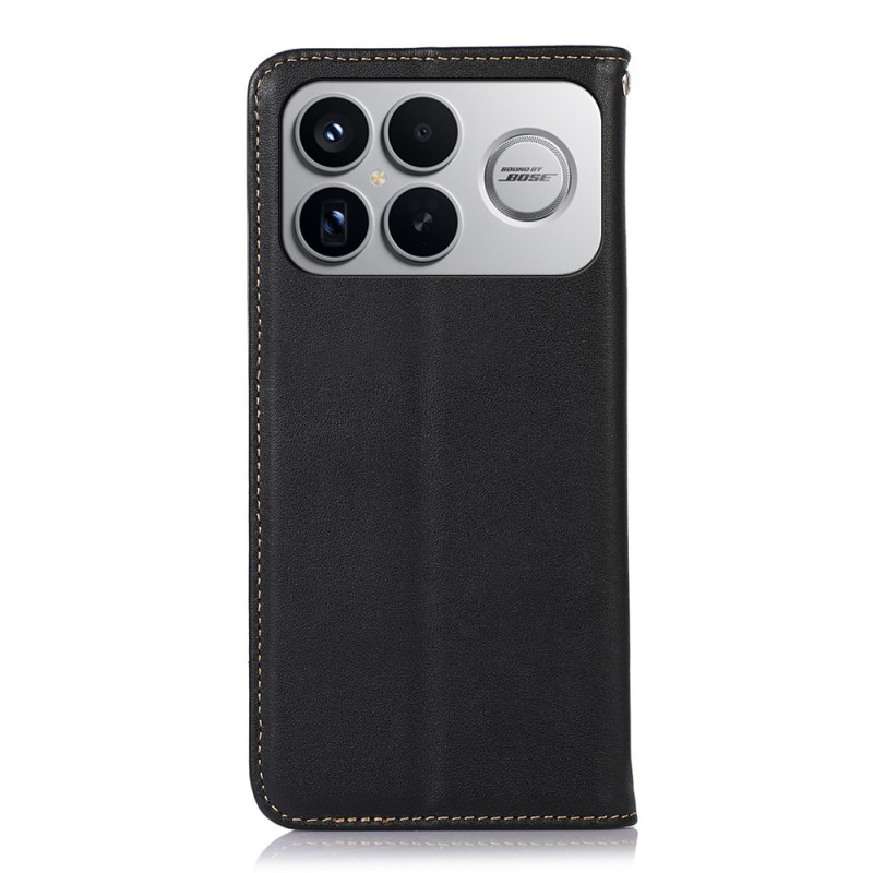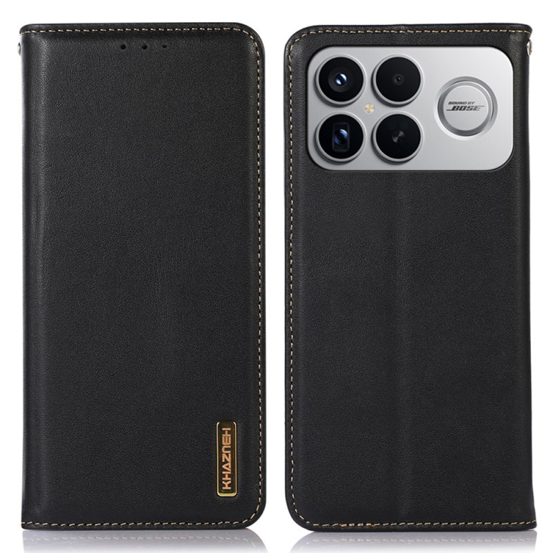 Étui portefeuille premium en cuir de vache véritable avec texture Nappa pour Xiaomi Poco F8 Ultra. Conception 2-en-1 avec support intégré, protection RFID, fermeture magnétique et orifice pour appels. Allie élégance et protection complète.