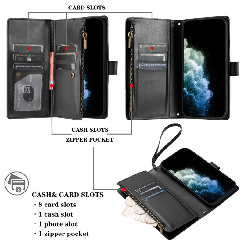 Étui portefeuille multifonction en cuir PU pour Xiaomi Poco M7 4G. Design élégant avec 8 emplacements pour cartes, poche zippée, support mains libres et dragonne amovible. Protection antichoc optimale pour votre smartphone au quotidien.