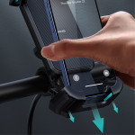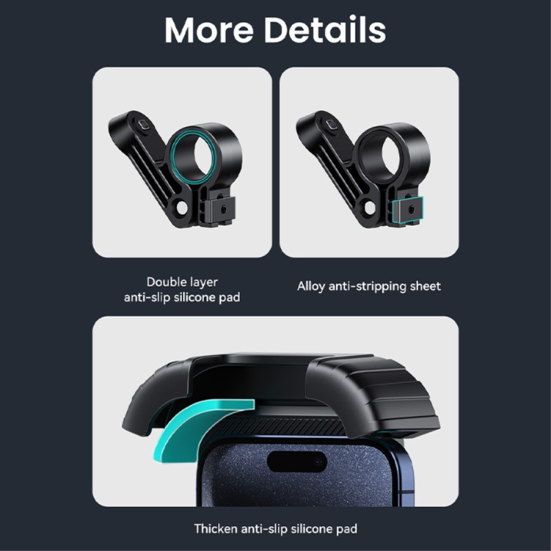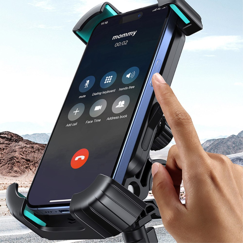 Tämä USAMS-kiinnike, joka on suunniteltu kestämään tien kolhuja ja kolhuja, takaa välittömän pääsyn navigointiin ja turvallisuuden. Yhden napsautuksen lukitusmekanismi takaa älypuhelimen (4,7-6,7 tuumaa) välittömän kiinnityksen ohjaustankoon ilman irtoamisriskiä. PC:stä ja silikonista valmistettu kiinnike tarjoaa sekä kestävyyttä että tärinänvaimennusta. Sen 360 astetta kääntyvä pää mahdollistaa katselukulman optimaalisen säätämisen, ja sen älykäs muotoilu säilyttää pääsyn näytön painikkeisiin ja toimintoihin.