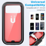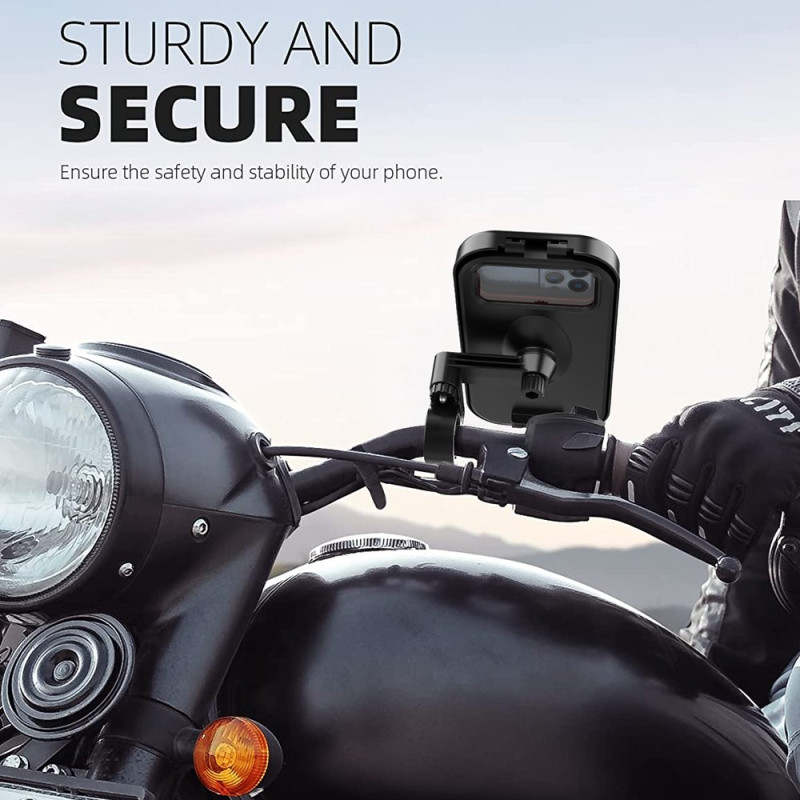 Täysin vedenpitävän rakenteensa ansiosta navigointi on nyt taattu myös kovimmissa kaatosateissa. Tämä kiinnike on suunniteltu erityisesti kiinnitettäväksi tukevasti moottoripyörän tai sähköpyörän taustapeiliin (10 mm:n aukko). ABS- ja nailonkuitukotelo suojaa puhelinta (4,7-6,8 tuumaa) vedeltä, hiekalta ja pölyltä. Silikonityynyt ja sisäinen sieni vaimentavat iskuja ja tärinää. Pallonivel mahdollistaa 360°:n kääntämisen optimaalisia katselukulmia varten, ja kosketusnäytön täysi käyttömahdollisuus takaa helppokäyttöisyyden.