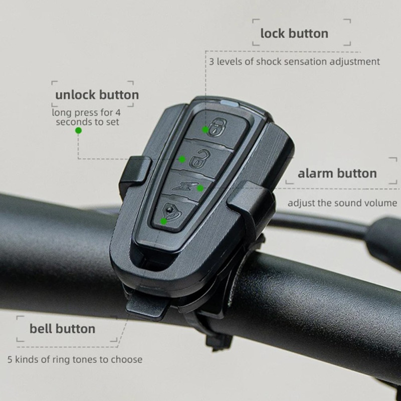 Tässä laitteessa yhdistyvät hälytys ja kello älykkäällä tavalla, olipa kyse sitten läsnäolosi ilmoittamisesta tai pyöräsi suojaamisesta. Tämä ROCKBROS-yksikkö tarjoaa kaksitoiminnallisuuden: sähköinen kello, joka on säädettävissä jopa 115 dB:iin, ja kosketusherkkä varkaudenestohälytysjärjestelmä. Laitetta ohjataan langattomalla kaukosäätimellä, jota voidaan käyttää jopa 80 metrin ja äisyydellä avoimella kentällä. Sen 400 mAh:n litiumakku takaa pitkän autonomian ja nopean latautumisen. Se on IPX5-sertifioitu, joten se kestää vettä ja pölyä. Sen kompakti ja kevyt muoto on suunniteltu huomaamatonta asennusta varten.