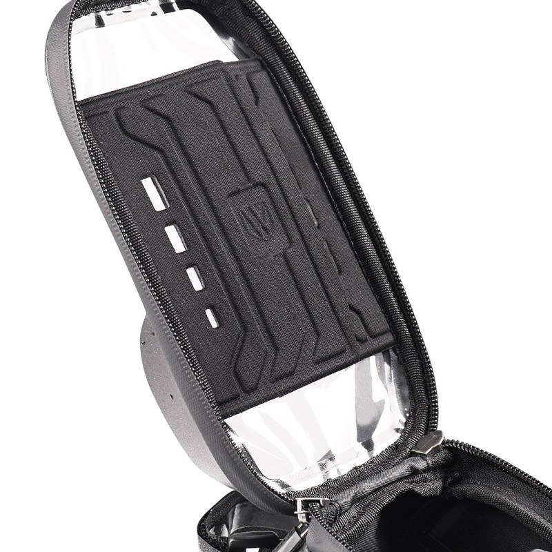 Tämän runkolaukun lupauksena on yhdistää moderni hiilikuituestetiikka ja iskunkestävyys. Sen jäykkä EVA-kuorirakenne suojaa laitteitasi iskuilta, kun taas hiilikuitupinnoite antaa sille hienostuneen tyylin. Vedenpitävyyttä parantaa vedenkestävä vetoketju. Integroitu heijastinnauha parantaa passiivista turvallisuutta yöllä. Aurinkovisiiri parantaa kosketusnäytön (jopa 7 tuumaa) näkyvyyttä suorassa auringonvalossa. Se on nopea asentaa, eikä vaadi työkaluja.