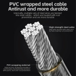 Tämän varkaudenestolaitteen monimateriaalinen rakenne takaa luotettavan suojan omaisuuttasi varkauksia vastaan. Siinä yhdistyvät tarkkuusvalettu sinkkiseoksesta valmistettu lukituspää ja luja teräsvaijeri, joka muodostaa vankan rakenteen. PVC-komposiittia oleva ulkokuori suojaa tehokkaasti sateelta ja korroosiolta, ja ABS-muovikuori on iskunkestävä. Sen 313 g:n höyhenpaino tekee siitä helposti kannettavan. Kokonaispituus on 115 cm, joten se sopii erinomaisesti polkupyörien, sähköskoottereiden tai lasiovien kiinnittämiseen kiinteisiin kohteisiin.