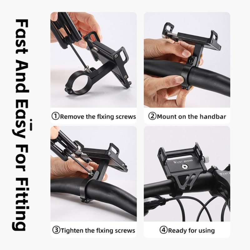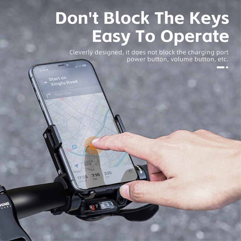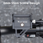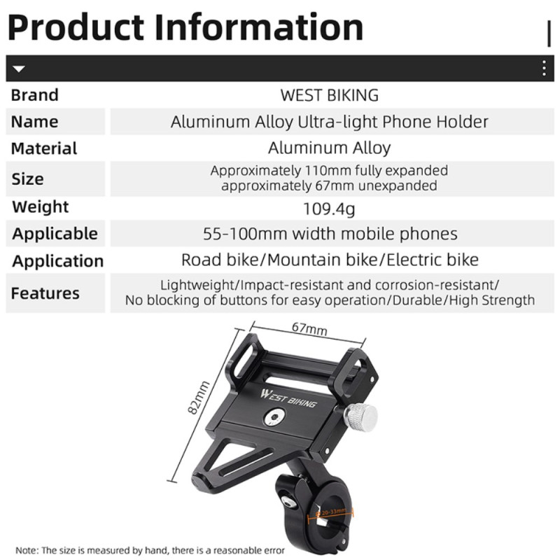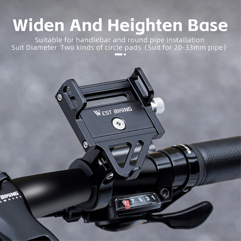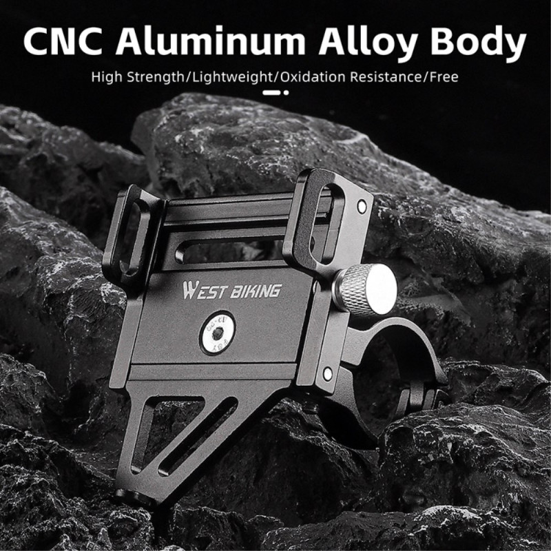 CNC-työstetty alumiiniseos antaa tälle puhelimen pidikkeelle vertaansa vailla olevan kestävyyden, keveyden ja hapettumisen kestävyyden. Tämä vain 109,4 g painava WEST BIKING -laite on suunniteltu kiinnittämään 55 mm:n ja 100 mm:n levyiset puhelimet. Älykäs muotoilu säilyttää pääsyn sivupainikkeisiin ja latausporttiin. Leveä, korkea pohja sopii turvallisesti 20mm - 33mm pyöreiden putkien päälle. 6 mm:n ruuvisäädön ansiosta kiinnityskulma voidaan optimoida parhaan mahdollisen vakauden ja näkyvyyden saavuttamiseksi kaikentyyppisissä pyörissä.