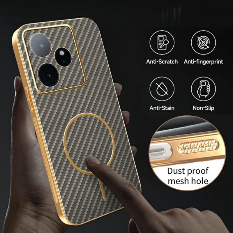 Ensiluokkainen suojaus Realme GT 7 5G -puhelimelle hiilikuitukuvioidulla TPU-kuorella. Tyylikäs elektrolyyttinen viimeistely kestää sormenjälkiä ja iskuja. Korotetut reunukset suojaavat näyttöä ja kameraa.