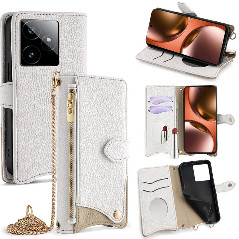 Monikäyttöinen lompakkokotelo Realme GT 7 5G:lle, jossa on epäsäännöllinen fishtail-muotoilu. Sisältää 2 korttipaikkaa, meikkipeilin, vetoketjullisen taskun ja 1,2 metrin ketju-olkahihnan. Optimaalinen suoja magneettisuljin.