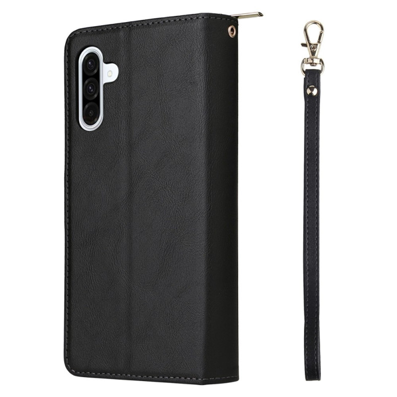 Monikäyttöinen PU nahkakotelo Samsung Galaxy A57 5G. Sisältää 9 korttipaikkaa, vetoketjullisen taskun käteiselle ja käytännöllisen käsihihnan. Turvallinen magneettisuljenta ja integroitu pidike handsfree-käyttöä varten.