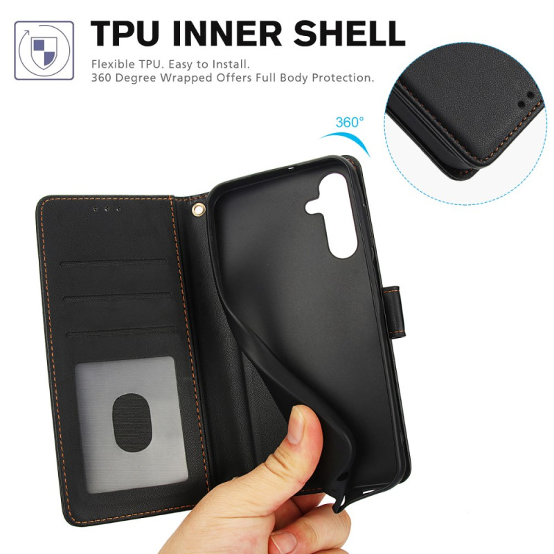 Suojaa Samsung Galaxy A57 5G -puhelimesi tyylikkäästi tällä korkealaatuisella PU-nahasta valmistetulla lompakkokotelolla. Siinä on 3 korttipaikkaa, muistiinpanotasku ja jalusta-toiminto, joten siinä yhdistyvät tyylikkyys ja käytännöllisyys. Irrotettava rannehihna ja turvallinen magneettikiinnitys tarjoavat täydellisen suojan jokapäiväiseen käyttöön.