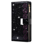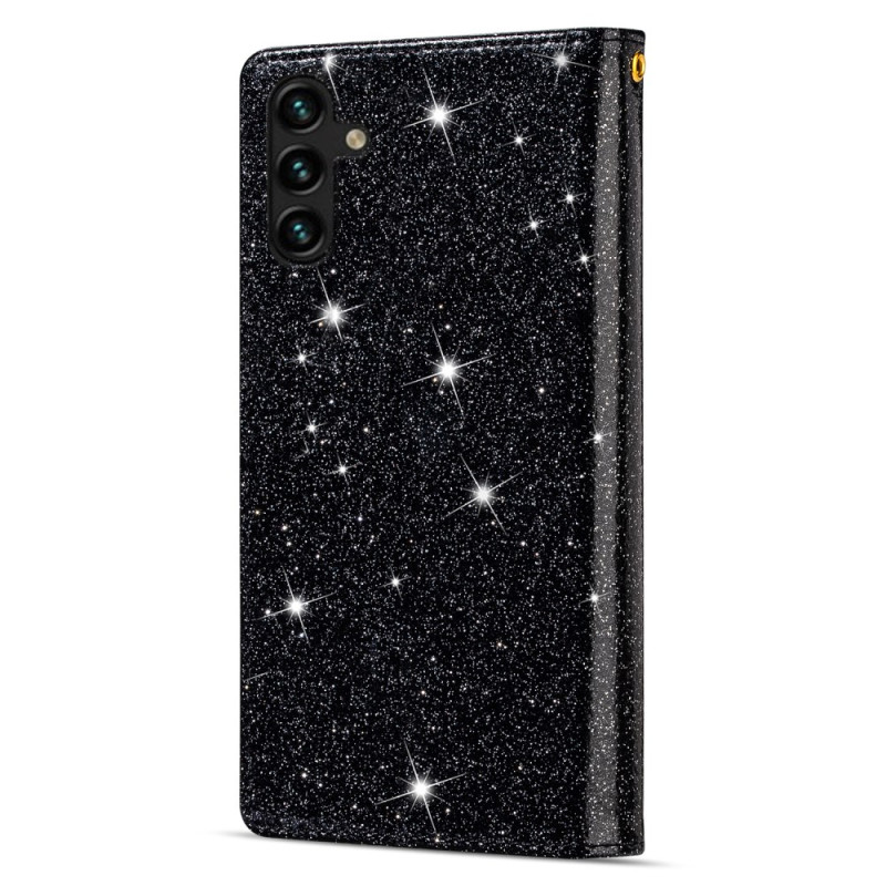 Tyylikäs lompakkokotelo Samsung Galaxy A57 5G -puhelimelle, jossa on laserkaiverrettu tähtitaivaan muotoilu ja glitteriä. Sisältää korttipaikat, vetoketjullisen taskun ja käytännöllisen käsivarsinauhan turvallista kantamista varten.