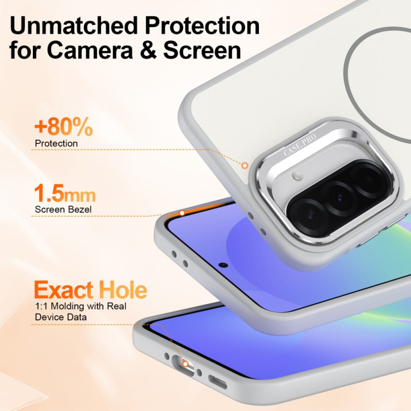 Täydellinen suojaus Samsung Galaxy A57 5G:lle. Hybridi PC + TPU kuori integroidulla magneettirenkaalla, kokoontaitettavalla jalustalla ja suojaavalla linssikehyksellä. Iskunkestävä muotoilu vahvistetuilla kulmilla ja täydellä pääsyllä ominaisuuksiin.