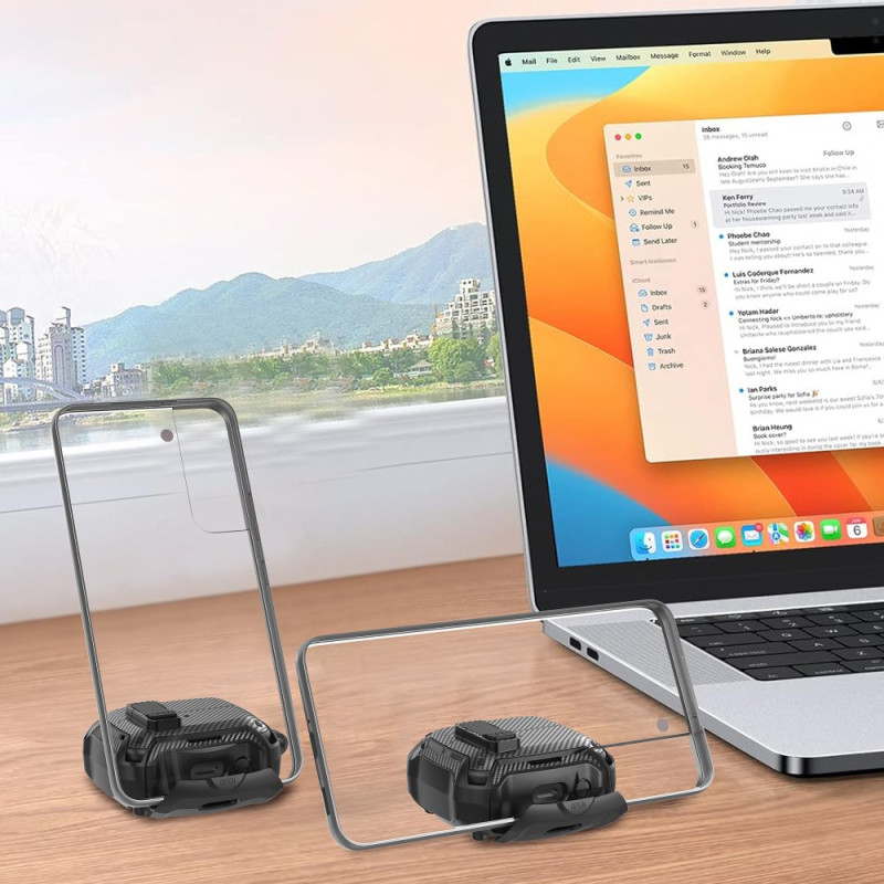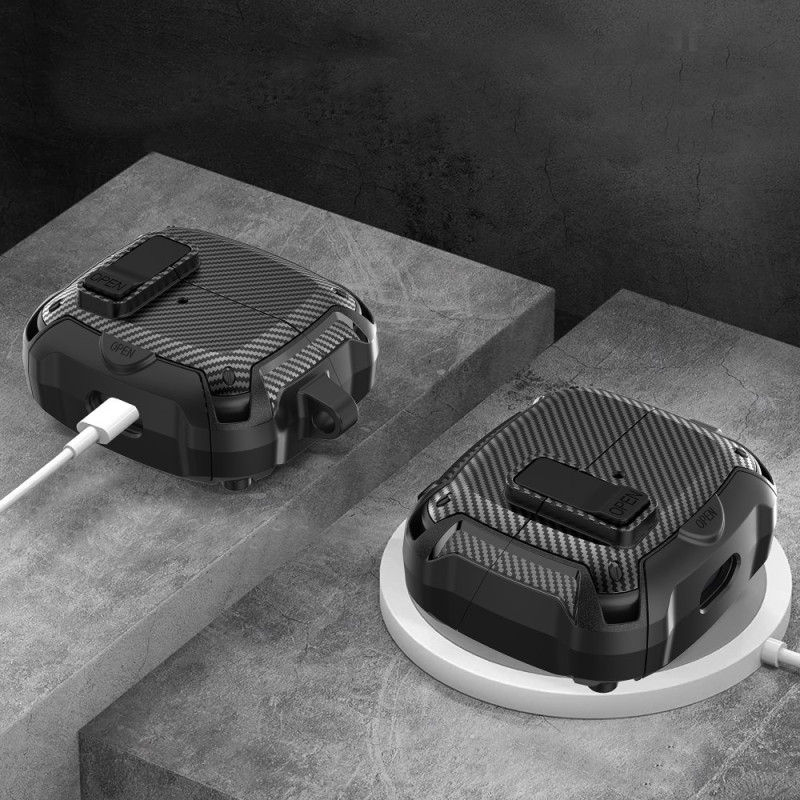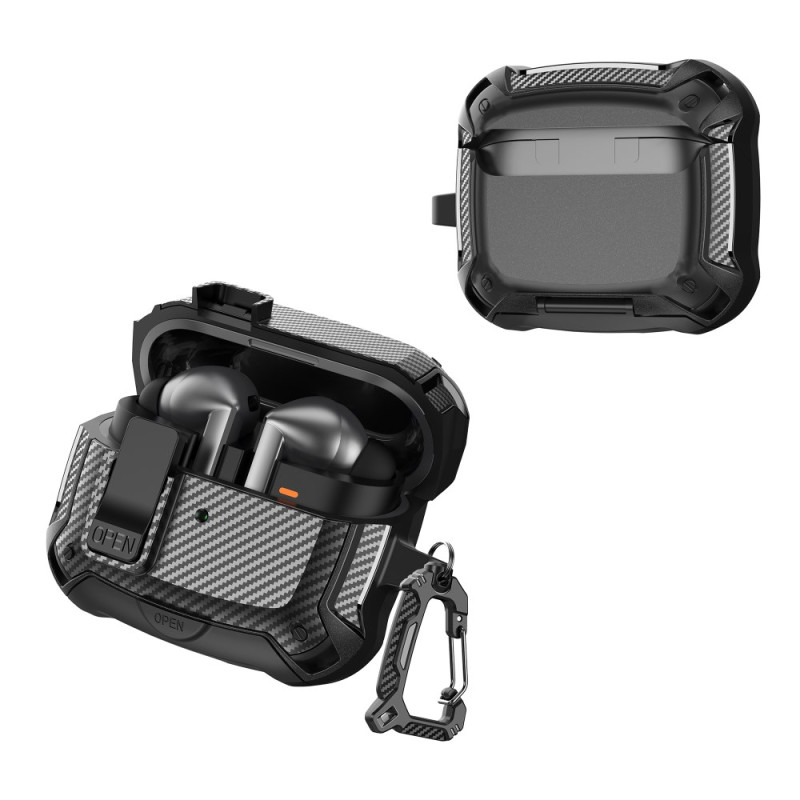 Tutustu premium-suojakoteloon Samsung Galaxy Buds3 Pro / Buds3 -kuulokkeillesi. Laadukkaasta TPU:sta ja PC:stä valmistettu hiilikuituinen suojakotelo tarjoaa kestävän suojan naarmuja ja putoamisia vastaan. Sen käytännöllinen muotoilu mahdollistaa nopean pääsyn kuulokkeisiin ja sisältää taitettavan pidikkeen puhelimelle.