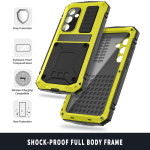 Tukeva monimateriaalikotelo Samsung Galaxy S25 5G:lle, jossa on integroitu näytönsuoja, integroitu jalusta ja langattoman latauksen yhteensopivuus.