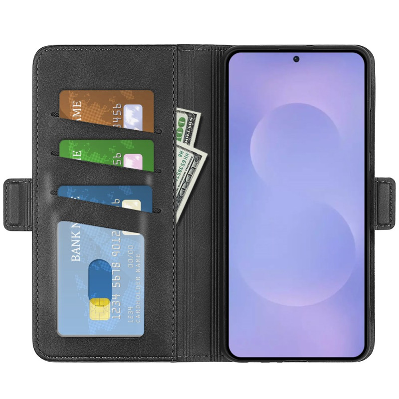 Suojaa Samsung Galaxy S26 -puhelimesi tyylikkäästi tällä vasikkatekstuurisella PU-nahasta valmistetulla lompakkokotelolla. Käytännöllinen all-in-one-muotoilu, jossa on korttipaikat, käteistasku ja säädettävä handsfree-toiminto.