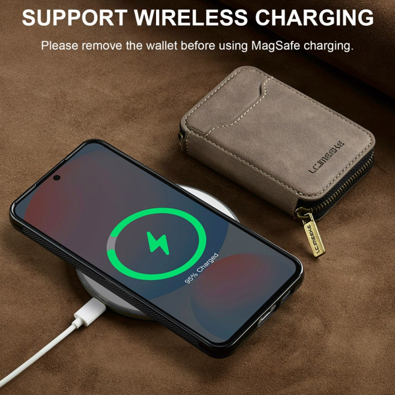Étui 2 en 1 innovant avec portefeuille détachable magnétique et coque slim. Rangement sécurisé avec fermeture éclair pour plus de 10 cartes, espèces et clés. Protection anti-RFID intégrée pour sécuriser vos données bancaires. Compatible MagSafe.