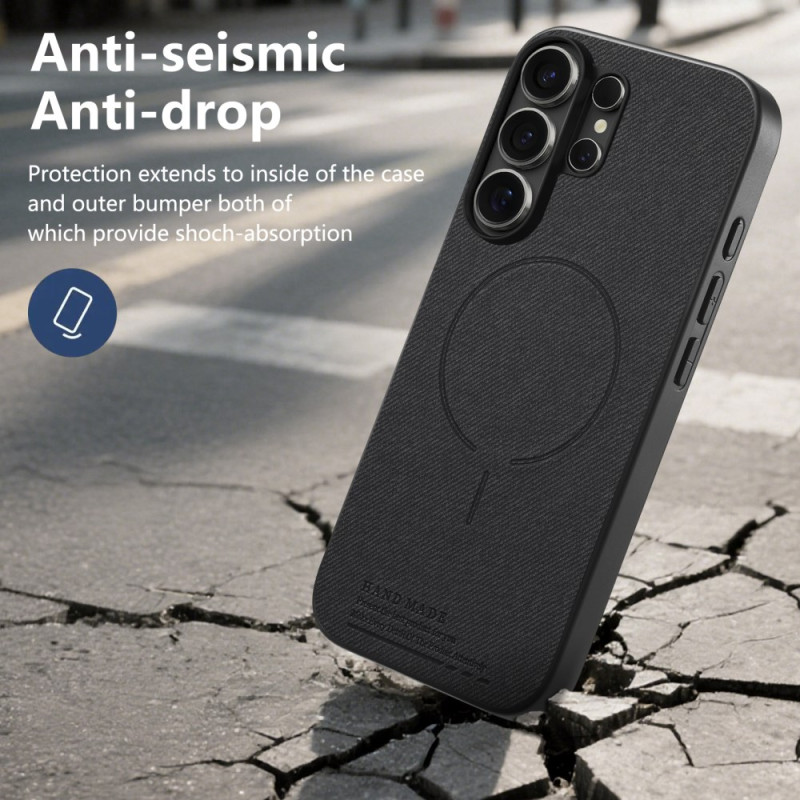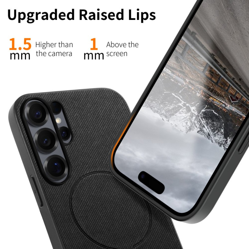 Protection premium pour Samsung Galaxy S26 Ultra avec texture tissu élégante. Design magnétique compatible avec accessoires, double absorption des chocs et protection anti-rayures. Bords surélevés pour protéger l'écran et les objectifs.