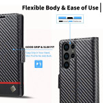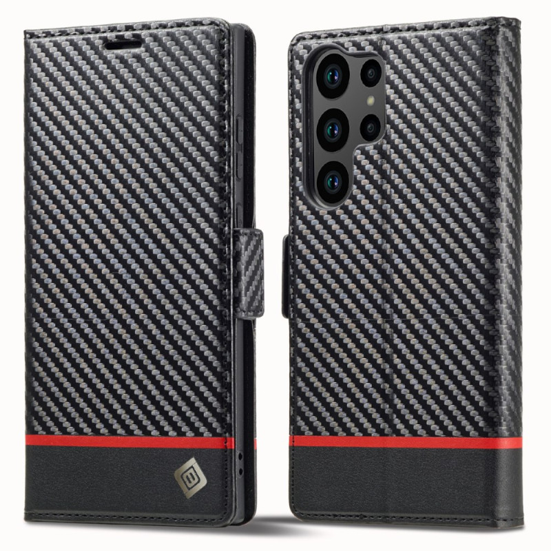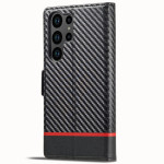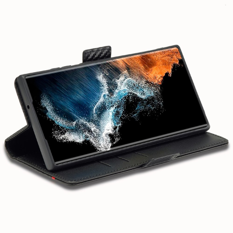 Étui portefeuille élégant pour Samsung Galaxy S26 Ultra avec texture fibre de carbone. Conception pratique avec 3 emplacements pour cartes, 1 compartiment pour espèces et support de visionnage mains libres. Protection intégrale avec fermeture magnétique sécurisée.