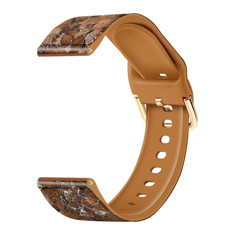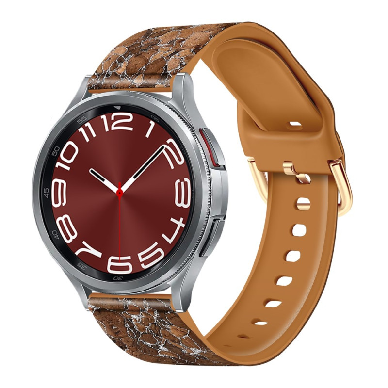 Tutustu tyylikkääseen ja kestävään rannekkeeseen Samsung Galaxy Watch6:lle. Se on valmistettu aidosta puunahasta ja antibakteerisesta TPE:stä ja tarjoaa ainutlaatuista tyyliä eloisan puukuvionsa ansiosta.