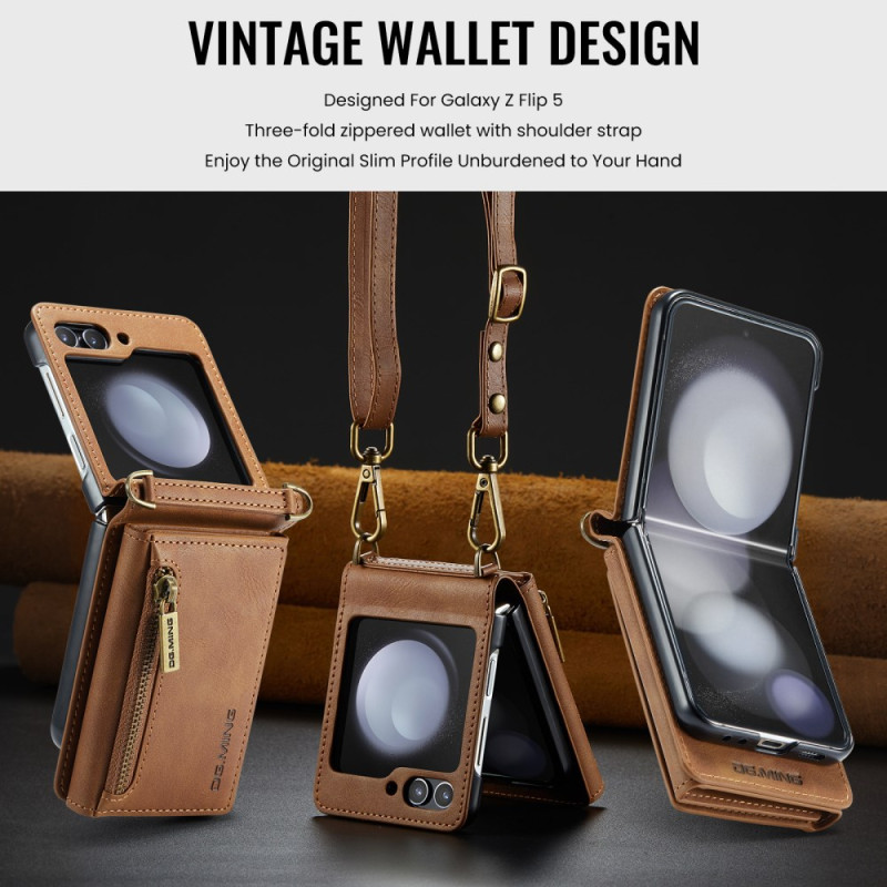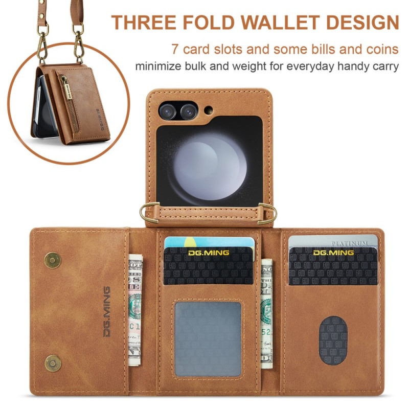 Tutustu DG.MING M5-sarjan koteloon Samsung Galaxy Z Flipille, jossa yhdistyvät tyyli ja suojaus. Kestävästä PU-nahasta ja jäykästä PC-kehyksestä valmistettu suojakotelo tarjoaa kätevän säilytystilan korteille ja rahoille. Hyödynnä sisäänrakennettua pidiketoimintoa ja RFID-sulkutekniikkaa lisäturvaa varten. Toiminnallisessa muotoilussa on magneettisuljenta ja irrotettava olkahihna maksimaalista monipuolisuutta varten.