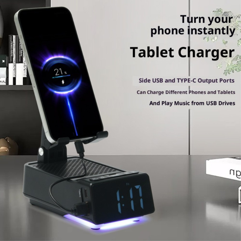 Tämä monikäyttöinen laite on valaistuksen, ajanhallinnan ja ääniviihdearvon asiantunteva yhdistelmä. Tässä 4-in-1-asemassa on Bluetooth 5.1 -kaiutin, joka tarjoaa rikkaan 360°-äänen, ja digitaalikello, jossa on kaksi hälytystä. Sen jalusta on säädettävissä 180 astetta, mikä mahdollistaa ergonomisen katselun pysty- ja vaakatasossa. Ympäristövalaistus tarjoaa seitsemän dynaamista tilaa (asteittainen, hengittävä, kiinteät värit), jotka luovat rentouttavan ilmapiirin. Integroitu 2000 mAh:n akku mahdollistaa jopa 4 tunnin jatkuvan langattoman toiston.