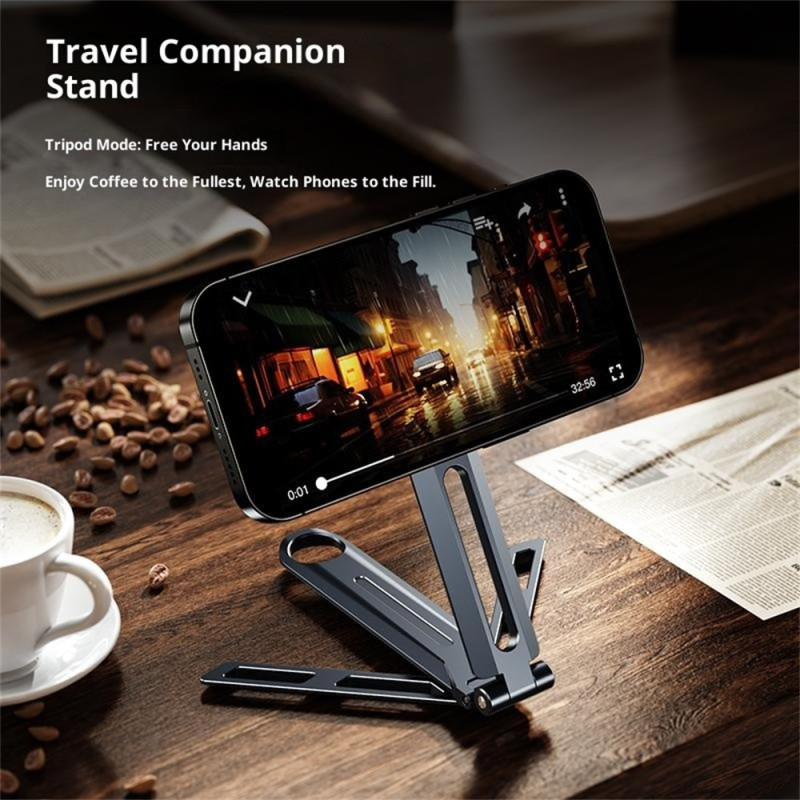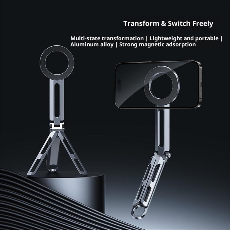 Tämä liikkeellä oleville ammattilaisille suunniteltu jalusta poistaa MagSafe-tekniikan ansiosta langallisen kiinnityksen aiheuttaman kitkan. Kestävästä alumiiniseoksesta valmistetussa jalustassa on vakaa rakenne, ja se painaa vain 100 grammaa. Sen täysin kokoontaitettava muotoilu (15x6,5x2,5 cm) helpottaa sen säilyttämistä salkussa tai laukussa. Integroitu MagSafe-järjestelmä kiinnittää puhelimen välittömästi ja turvallisesti magneettisesti. Pidike sopii 4-7 tuuman älypuhelimille ja tarjoaa tyylikkään handsfree-ratkaisun toimistoon tai matkapöydälle.