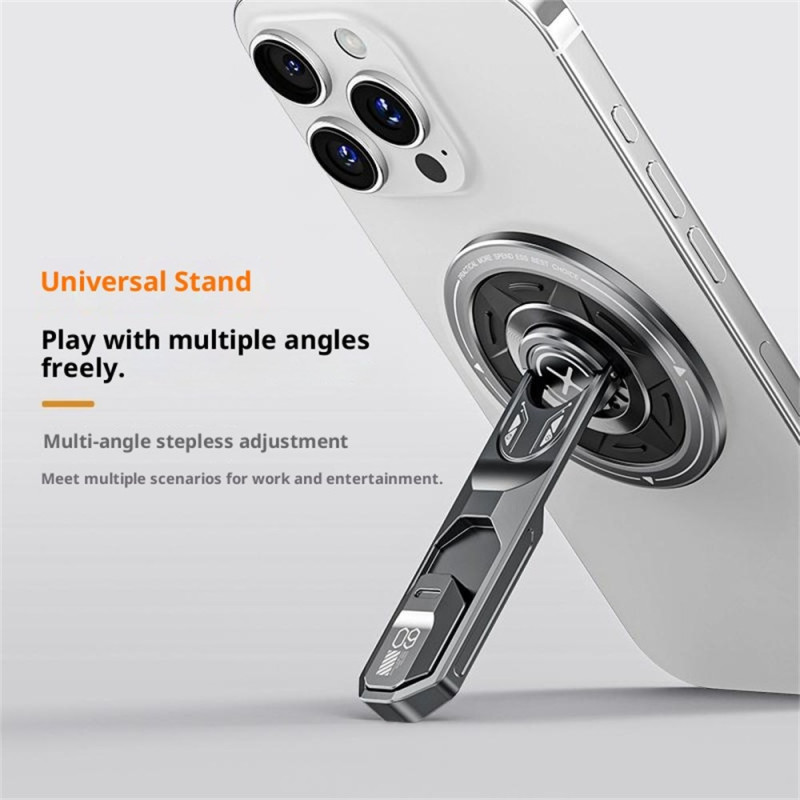 Monipuolisen jalustan huomaamaton integrointi puu- ja alumiinirakenteeseen maksimoi toiminnallisuuden painamatta laitetta. Jalustassa yhdistyvät puun lämmin estetiikka ja alumiiniseoksen kestävyys. Sen höyhenenkevyt 46 g:n paino ja kokoontaitettava muotoilu tekevät siitä ihanteellisen kuljetukseen. Kaksipuolisen magneetin ansiosta se kiinnittää puhelimen (4-7 tuumaa) tukevasti ja mukautuu erilaisille rautapinnoille (keittiö, toimisto). 360 asteen kierto mahdollistaa tarkan säädön kaikkiin katselutarpeisiin.