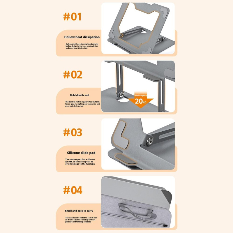 Tämä kokoontaitettava matkapuhelimen jalusta tarjoaa optimaalisen ergonomian sen portaattomasti säädettävän korkeusjärjestelmän ansiosta, jonka avulla voit asettaa laitteesi ihanteelliseen kulmaan. Se on valmistettu tukevasta hiiliteräksestä, jossa on liukastumista estävät silikonivyöhykkeet, ja se takaa täydellisen vakauden ja kestää jopa 10 kg:n kuorman. Sen uritettu muotoilu edistää erinomaista ilmankiertoa ja auttaa estämään ylikuumenemisen pitkäaikaisen käytön aikana. Kokoontaitettava ja helppo kuljettaa, se sopii yhtä hyvin kotiin kuin toimistoonkin, ja se sopii kaikille enintään 17,3 tuuman laitteille.