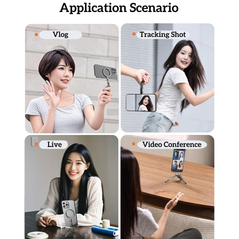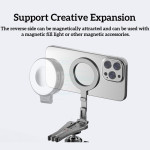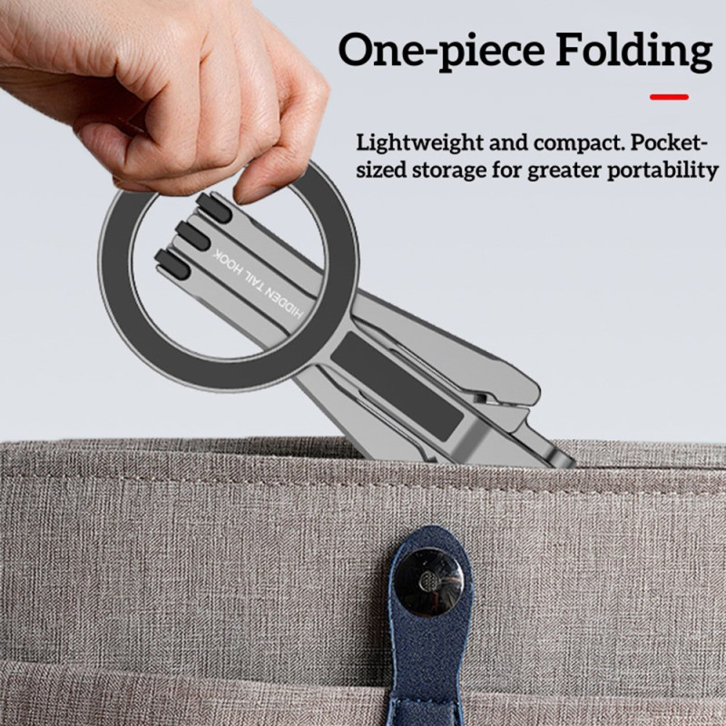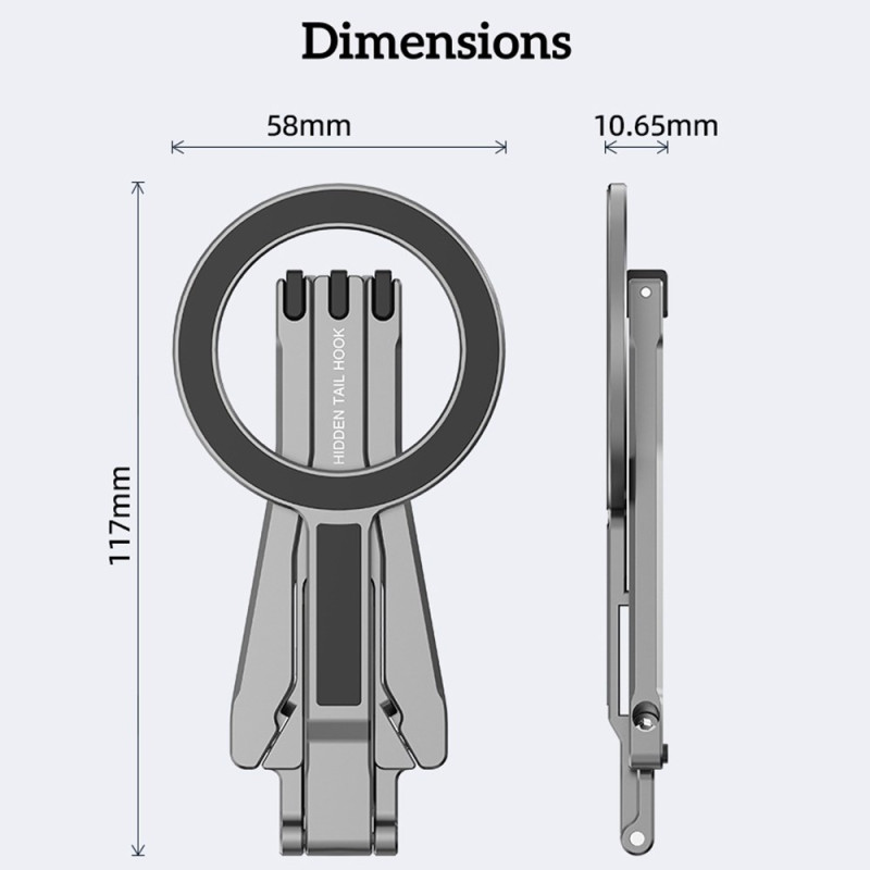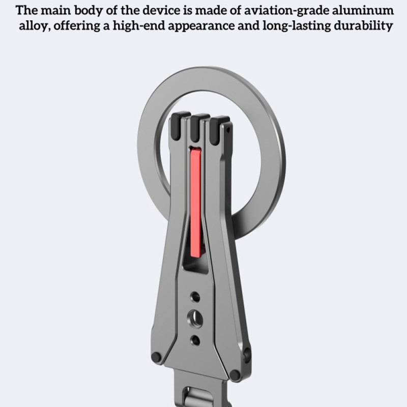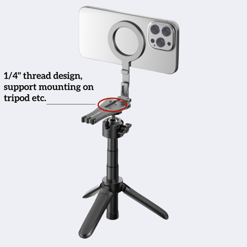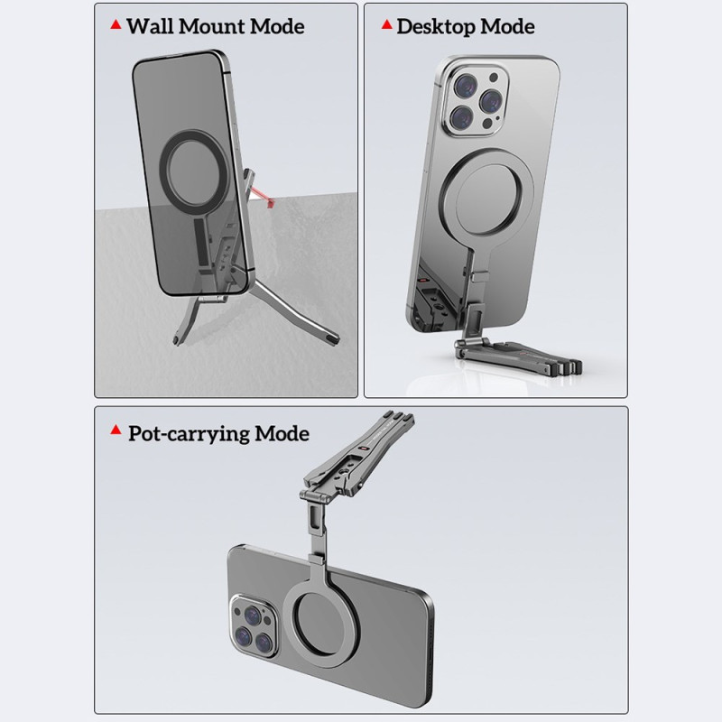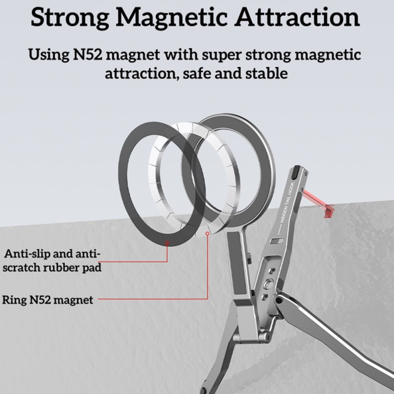 Tämä magneettinen pidike on kokoontaitettava kolmijalka, joka on suunniteltu tarjoamaan monipuolisen ja erittäin käytännöllisen handsfree-kokemuksen. Se on yhteensopiva iPhone 12-16 -puhelinten kanssa suoran magneettikiinnityksen tai MagSafe-kuorien ansiosta, ja siihen mahtuu myös muita älypuhelimia mukana toimitetun magneettirenkaan avulla. Se on valmistettu vahvasta, kevyestä alumiiniseoksesta, ja siinä on tehokkaat alumiini-rauta-boori-magneetit, jotka takaavat turvallisen pidon. Pienikokoinen kokoontaitettuna (117 × 58 × 10,65 mm) ja vain 60 g painava jalusta toimii tarpeen mukaan kolmijalka-, pöytä- tai kallistustelineenä.