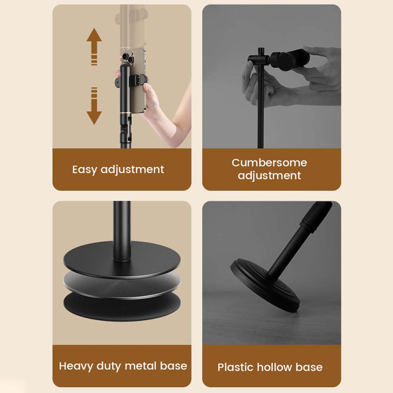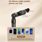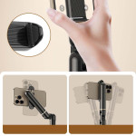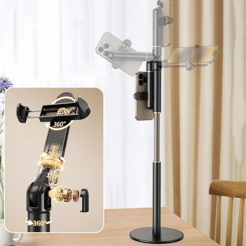 Tämä ulosvedettävä, pyörivä puhelimen pidike on ihanteellinen suoratoistoon, sisällön luomiseen tai videoneuvotteluihin. Sen 53-63 cm:n pituisen säädettävän varren avulla on helppo säätää korkeutta täydellistä kehystystä varten, ja 360°:n kääntyvyyden ansiosta voit vaihtaa nopeasti muotokuvan ja vaakatason välillä. Se on valmistettu hiiliteräksestä, alumiiniseoksesta ja ABS:stä, joten se tarjoaa erinomaisen vakauden myös ilmakuvia otettaessa. Se on yhteensopiva 6-8 cm leveiden älypuhelinten kanssa ja sopii useimpiin nykyaikaisiin malleihin. Vankka ja kompakti, se on luotettava tuki jokapäiväiseen käyttöön.